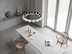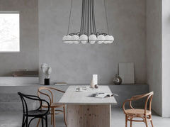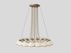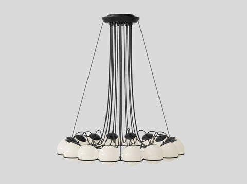 The Le Sfere Chandelier is composed of a circular array of blown opaline glass spheres. Each sphere is held in place by a large Black or Champagne painted steel radial ring structure. The spheres can be oriented downward or upward to provide direct or indirect illumination.