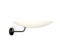 Made from folded metal, this light creates a precisely focused effect, shielded from the eye. In the mid-50s, Pierre Disderot designed an elegant sconce in the spirit of his 1013 table lamp ; the tip of a sphere attaches to the wall by a thin clip and projects the light towards the ceiling to create ambient lighting in the room. The soberness and minimalism of this luminaire is resumed in the shape of a classic luminous bowl, the colored and perforated metal material is typical of the 1950’s, yet its proportions and finishing give it a timeless aesthetic.