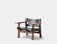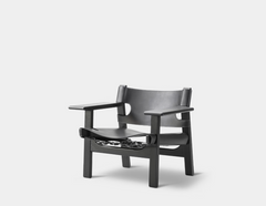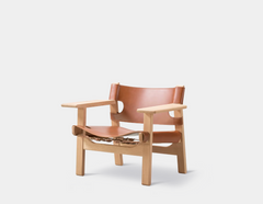 With the Spanish Chair Mogensen expanded upon his work with solid oak and saddle leather. The chair was launched in 1958 as part of an innovative living space exhibition, in which all tables were removed from the floor to create an open living space.