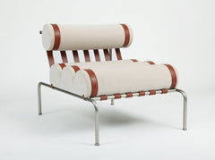 metal frame, leather bands sewn onto the cushion, fabric upholstery