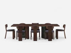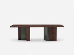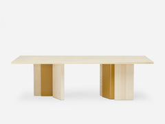 Inspired by the binary star in the northern constellation of Boötes, Izar is a sculptural dining table crafted in solid timber with details in satin matte or high gloss painted hdf. In an elegant encounter between two contrasting materials, Guerrée expresses his artistry by playing with the volume under the tabletop, adding two asymmetrical legs that give a rhythm to the whole.