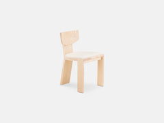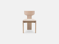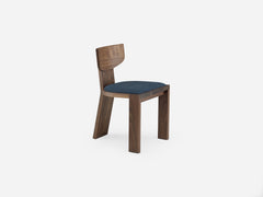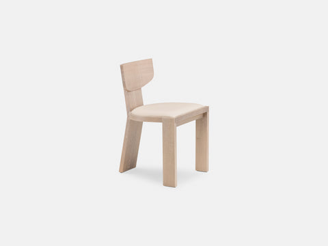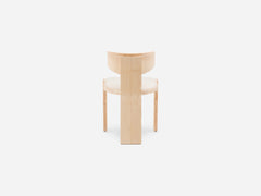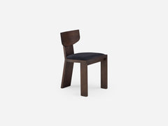 The Vega chairs are named after the North Star of the Past and the Futures. Sculptural and totemic in shape, the three-legged chairs designed by Anthony Guerrée are crafted in solid timber and feature an upholstered seat. The imposing appearance contrasts with the delicate curve of the crescent moon backrest. In a playful game of opposites, Vega A and Vega B can be differentiated by the orientation of their backrests.