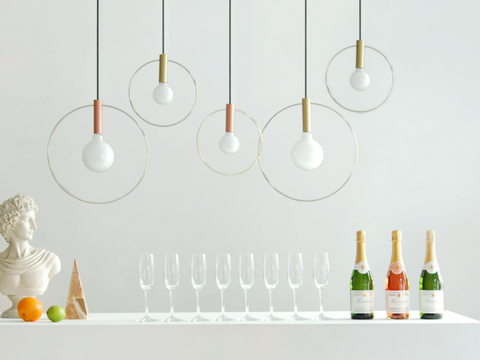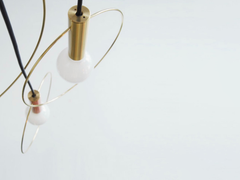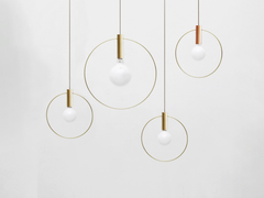 Light pared down into its two elemental ingredients: the source (the bulb) and its illumination (highlighted by a brass ring) The resulting Aura pendant lights are simple and versatile. The two available sizes can be hung individually at adjustable heights or in clusters and rows. Bulbs are sold separately to provide clients the option to select their own bulbs to their specifications.