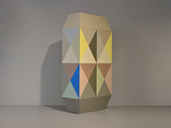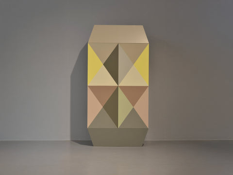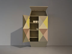 Regard Grande is a cabinet made of lacquered wood on an integrated pedestal. Once the double-wing doors are open, its construction and coloring give the impression of two, or even three, dimensions. The external ornamentation relates to the sculptural base and the top in a way that gives the optical illusion of a changing form. The coloring perfectly balances tension and harmony.