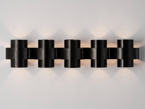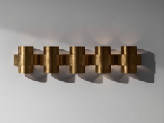 A 3-Dimensional plus is formed out of a single tube of brass that is cut, bent and finished. The light source nestled within emits soft beams of light showcasing its exceptional construction technique as embellishment. A compact form that multiplies to construct larger fixtures and individual wall hanging arrangements.