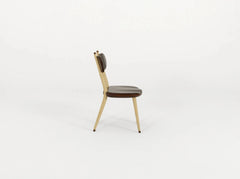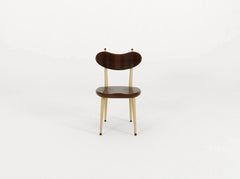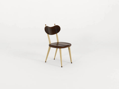 In beautiful tainted oak, this chair is designed to showcase the beauty of its curved legs, leather stitching and an exaggerated, unique curved seat.
