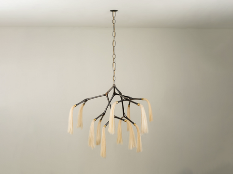 Cast bronze pieces, 12 lights with horsehair tassels, turned brass fittings, rayon sheathed electric cord