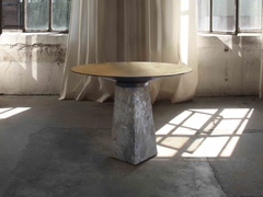 The concrete table base is an architectural elements from the designer's family home, which was dismantled during the renovation of the historic building. Here, the designer approaches the original pre-war fabric of the places he grew up in with great sentiment. In this way, the old world does not pass away, but in fact acquires greater significance.