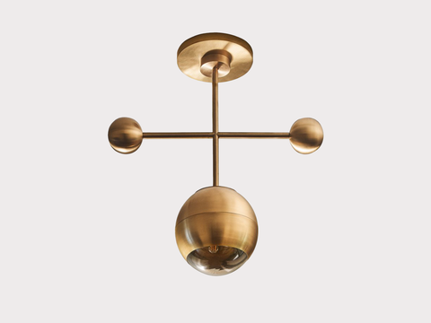 The transformation from a lamp to a chandelier enhances the design by expanding its presence, allowing light to emanate from multiple points and creating a dynamic, atmospheric effect throughout the space. As a chandelier, the design becomes a striking centerpiece, where the interplay of light and solid brass adds depth and visual intrigue to any room. This chandelier draws on two distinct forms: dishes or shields that transform from flat sheets of brass into structured, spherical shapes, and heavy machine components characterized by simple yet precisely engineered geometries.