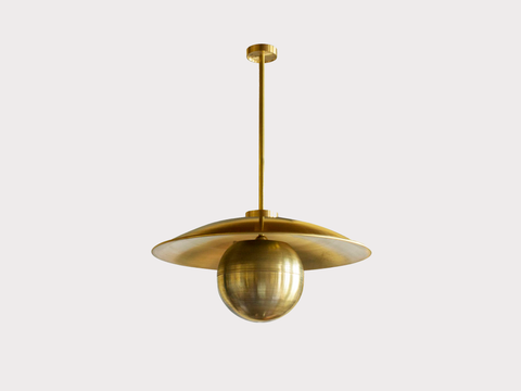The transformation from a lamp to a chandelier enhances the design by expanding its presence, allowing light to emanate from multiple points and creating a dynamic, atmospheric effect throughout the space. As a chandelier, the design becomes a striking centerpiece, where the interplay of light and solid brass adds depth and visual intrigue to any room. This chandelier draws on two distinct forms: dishes or shields that transform from flat sheets of brass into structured, spherical shapes, and heavy machine components characterized by simple yet precisely engineered geometries.