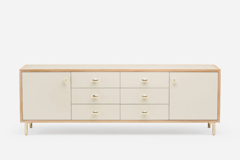 Inspired by the juxtaposition of old and new design seen in converted Brooklyn brownstones, Classon Sideboard is modern with historical references. Polished bronze door pulls and legs elegantly complement the cabinet body available in painted hdf and a range of timbers and finishes. Classon Sideboard is available in one size and a choice of six different configurations to suit a variety of storage needs.