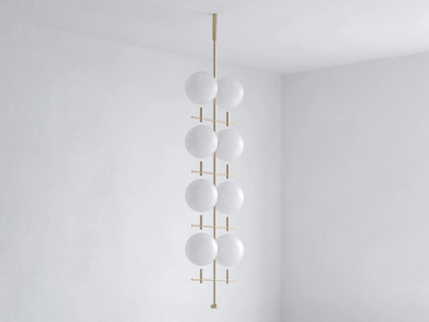 The collection of luminaries is inspired by the phases of the Moon. Its aesthetic is based on the contrast of the monumental hovering glass spheres and the subtle metal construction.
