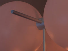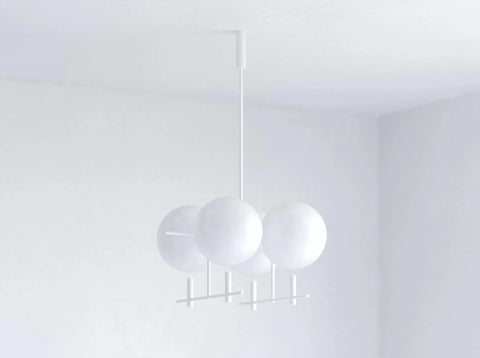 The collection of luminaries is inspired by the phases of the Moon. Its aesthetic is based on the contrast of the monumental hovering glass spheres and the subtle metal construction.