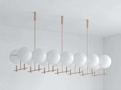 The collection of luminaries is inspired by the phases of the Moon. Its aesthetic is based on the contrast of the monumental hovering glass spheres and the subtle metal construction.