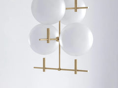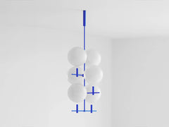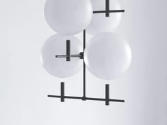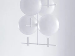 The collection of luminaries is inspired by the phases of the Moon. Its aesthetic is based on the contrast of the monumental hovering glass spheres and the subtle metal construction.