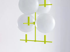 Technically, it offers two lighting options. The spheres either reflect the light or they glow from the inside. That is achieved thanks to separate lighting circuits. The one dimmable lighting source illuminates the spheres from the inside and the other illuminates the spheres from below, producing a diffused ambient warm light for an evening atmosphere.