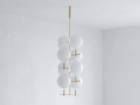 The collection of luminaries is inspired by the phases of the Moon. Its aesthetic is based on the contrast of the monumental hovering glass spheres and the subtle metal construction.