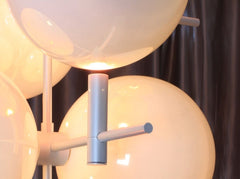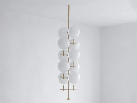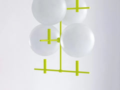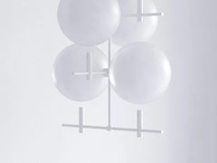 The collection of luminaries is inspired by the phases of the Moon. Its aesthetic is based on the contrast of the monumental hovering glass spheres and the subtle metal construction.