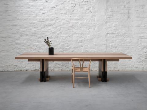 The design for a new table was created by the need for a simple aesthetic with an honest construction. By duplicating all elements, the table has a stable basis and also a certain finesse. The simple idea to split the elements creates an honest and visible construction that is self-supporting, with a nod to the Japanese design method.