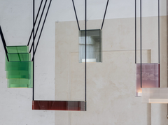 The Sainte Atelier series is a collection about the forces that anchor us, a suspension light in dialogue with gravity. Reimagining the rectangle in layered, colourful glass, Sainte offers an elegant floating mass supported by robust nylon ribbons. Powered by a flat wire embedded in the nylon, these anchors carry a casual, contemporary spirit: an everyday material flirting with its graceful, minimalist centre. The form can suspend from any angle and height, and in multiples, offering infinite architectures and possibilities. As a collection, it presents a dance of contrasting materials and an equilibrium of opposing powers.