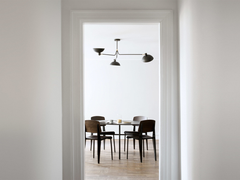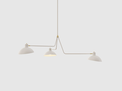 The Waldorf Collection combines an open hemispherical shade with a cylindrical socket cover. This composite shade is deployed in suspension and wall-mounted configurations with natural brass and powder coated rods. Moving parts add flexibility to the crisp, streamlined forms of this collection.