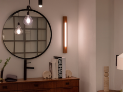 Altar is an exploration into the angular forms of Midcentury churches and altars, which often looked to warmer natural materials for fonts and pews. Altar’s elegant, fluted form is carved from solid oak and completed with an illuminated tube seamlessly nestled in its architectural grooves. The light is available as a surface mounted wall light, or as a pendant in three sizes.