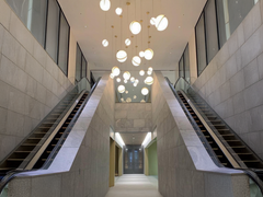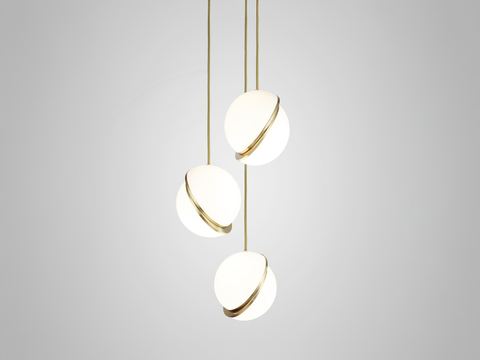 A miniature version of the popular Crescent Light, these three illuminated spheres are sliced asymmetrically in half to reveal a crescent-shaped brushed brass fascia which hang elegantly at various heights from a central ceiling plate. Mini Crescent seamlessly combines the solid and the opaque.
