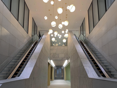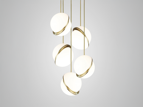 A miniature version of the popular Crescent Light, these five illuminated spheres are sliced asymmetrically in half to reveal a crescent-shaped brushed brass fascia which hang elegantly at various heights from a central ceiling plate. Mini Crescent seamlessly combines the solid and the opaque.