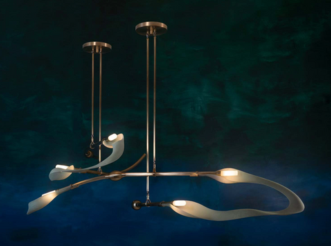 For this collection, Andrea Claire, an avid surfer, was inspired by the shapes of waving kelp forests just below the surface of the ocean. The studio developed an intricate system of CNC cut tools to hand cast these unique shapes in 1/8” fiberglass and resin. All metal components are specifically designed for this collection and milled from solid brass.