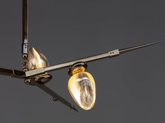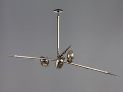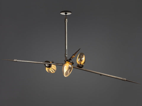 With a classic central balance point, this elegant pendant reaches out in radial 3 directions and clusters 3 handblown glass diffusers towards its center. As shown here, we offer the glass in our hand done Plasma finish which is mirrored when off, but is an abstract painting when on!