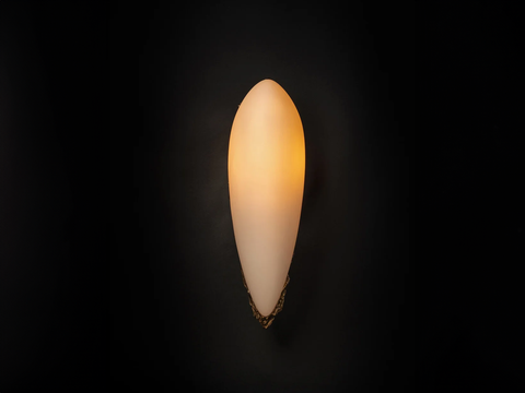 The LV-426 small sconce presents an intimate dialogue between light and material, where a translucent Limoges porcelain pod nestles within a cradle of sculptural bronze. This compact luminaire captures the collection's essence in a more restrained scale, preserving its otherworldly allure while adapting to more intimate spaces.