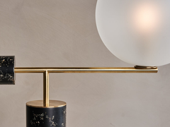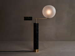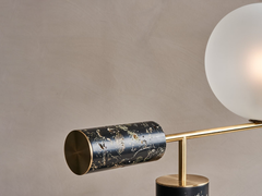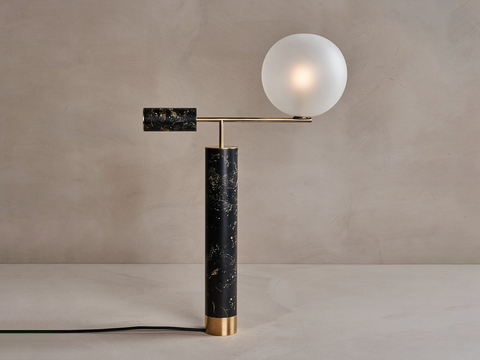 Flora Lamp I is a balanced composition of geometric cantilevered shapes, composed of brass, glass, and our unique Flora Perma material. A glass globe offsets the body, offering a soft dimmable light source. The body of the lamp is carefully machined to reveal the intricate and complex beauty of the cross sections of flowers, curve of petals, structure of leaves. Contrasted with black resin they appear as veins or fossils creating an almost stone like quality.