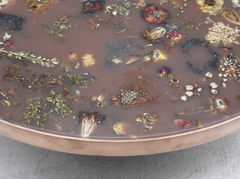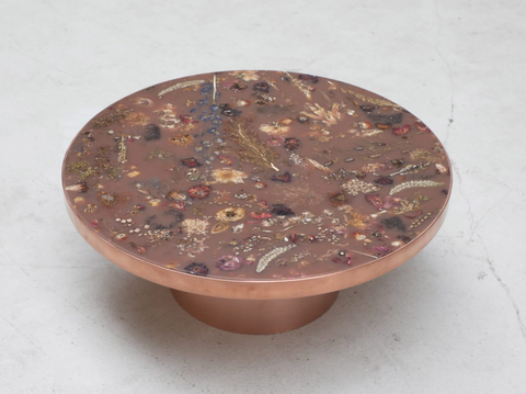 A unique low coffee table made from flowers cast in resin with a handmade steel structure coated with phosphor bronze. Finished in textured phosphor bronze and satin rust resin. The material reveals the intricate and complex beauty of the cross-sections of flowers, the curve of petals, and structure of leaves. Contrasted with resin, they appear as veins or fossils creating an almost stone-like quality.