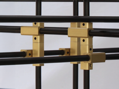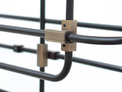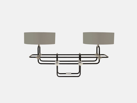 The Breuer Double Table Lamp is an elegant modernist design, inspired by Breuer's iconic tubular Wassily chair. The linear grid structure is embellished by multiple hand finished solid brass links, which add a luxurious jewel-like richness to this grand twin shade lamp. Made to order in many colors urs and metal finishes. Designed as a standalone lamp, and companion piece to the Breuer Chandelier.
