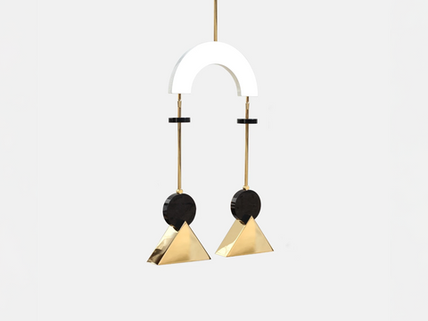 The Cairo Arc Pendant Light is a new addition to Martin Huxford's award winning Cairo series. Inspired by the radical geometry of Constructivist art, the pendant is constructed from a series of flattened volumes linked by linear tubes. The Cairo Arc is a graphic contemporary pendant light, designed with an innovative arrangement of suspended and pierced classic shapes, including circle, triangle and semi-circle.