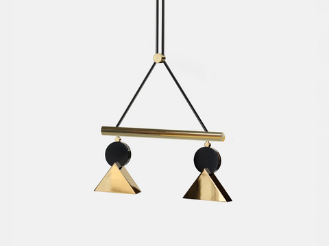 Cairo is a graphic contemporary lighting collection of pendants inspired by the influential Constructivist aesthetic. The Cairo Double Pendant explores spatial geometric abstraction, with its combination of patterned pyramid and disc forms, playing with perspective and visual planes. Drama is created by the radical balancing and piercing of the bold triangular and circular shapes, suspended in space by woven brass cable to create another airy triangle.
