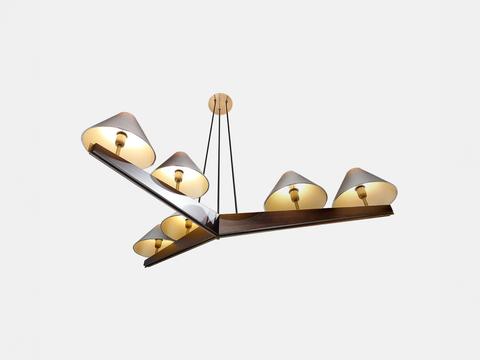 The Glide is a beautifully detailed chandelier, creating an harmonious circle of light with its three elegantly shaped walnut arms and multiple shades. The choice of handmade natural materials and the simple shape of the design make this a feature light for both modern and country settings. Each arm is tapered towards the end point, and supports two wide cone shaped shades, arranged along the top of the arm. The design works perfectly as a dining room or drawing room feature light.