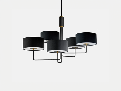 The elegant architectural shapes created by the five slender asymmetric arms of the Quintet Chandelier are softened by the contrast of the five circular shades. Decorative bands of hand polished brass on the arms and at the centre of each opaque diffuser, reinforce the harmonious circularity of the design.