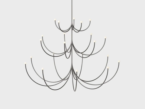 Arca is a lighting system whose form is a play of contrasts between the classical swooping branches and the spare minimalism of its linear, black composition. Tiers can be easily added together to create a unique chandelier.