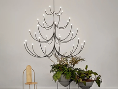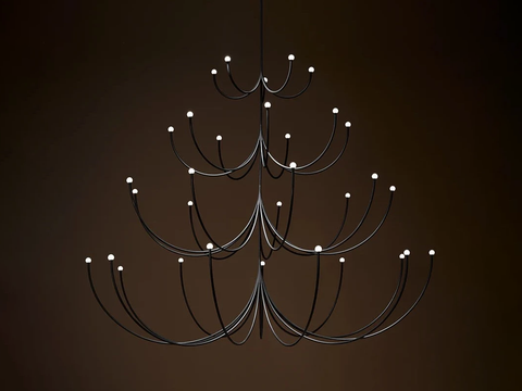 Arca is a lighting system whose form is a play of contrasts between the classical swooping branches and the spare minimalism of its linear, black composition. Tiers can be easily added together to create a unique chandelier.