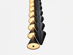 Legato, a musical reference indicating a smooth and unbroken connection of notes, is a modular system of lights that follows this same principle. Legato is available in both vertical and horizontal configurations. The vertical double strings offer flexible possibilities — from a side-by-side dual pendant to a soaring column of modules. The tandem up-facing and down-facing cones provide both soft reflected light from the ceiling and direct illumination.