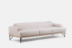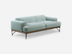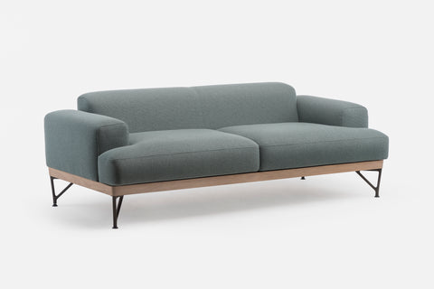 Armstrong sofa is a cool and brooding design with a low body and a base that subtly angles inward. Luxurious and robust, the sofa has refined upholstery resting upon an exposed timber frame and cast iron legs.