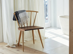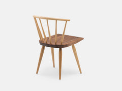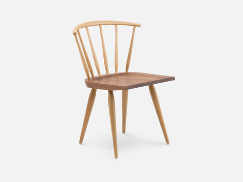 Ibstone is a Windsor chair named after a neighboring village of High Wycombe in Buckinghamshire, where the Windsor chair originated in the 18th century. The chair has a modernized, pared down form made using traditional Windsor chair making techniques in order to further the story, the evolution of the English Windsor chair. The contrast of the black walnut seat on this otherwise ash chair attractively highlights the wedge tenon detail where the leg intersects with the top of the seat. Part of a family of Windsor chairs including two dining chairs and two lounge chairs.