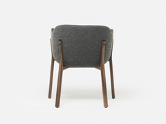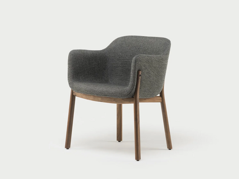 Porto is a comfortable tub dining chair with an exposed timber structure. Elegant and refined, its wraparound form is an expression of support, offering retreat. The slender timber leg frame, joined with mortise and tenon, crosses underneath the seat to visually lighten the form.