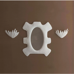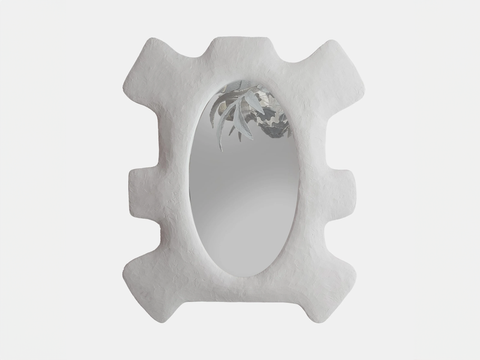 The Arundel Sculptural Mirror is a contemporary hand sculpted plaster mirror, dramatic in its scale and in its simplified cut-out shape. The distinctive curving outline and the overall symmetry of the piece pays tribute to the heraldic heritage and style of Elizabethan times, from the popular curved gables of 16th and 17th century grand country houses, down to the shapes found on buckles and rapiers. Martin Huxford’s contemporary design radically simplifies these references, stripping them of their elaborate decorative features for a smoothly detailed surface and simple outline.