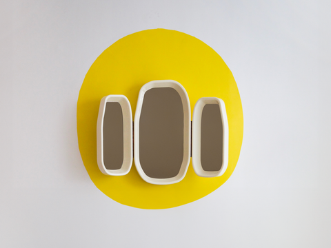 Frame coated with high gloss white lacquer, Solid brass hinge with patina finish, screws on back in same finish