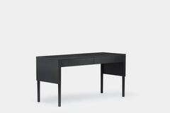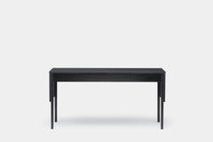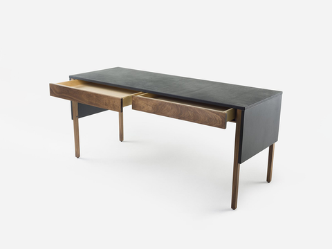 Drape Desk provides visual expression through thoughtful design: the leather-wrapped tabletop is articulated as a “drape” that falls over the table legs, lending a sense of continuity to the silhouette. Two drawers tucked underneath run the length of the table for ample storage. On the back, a flip down door reveals cable management.