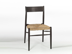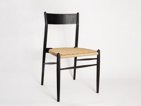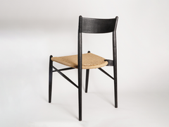 The angled struts, the feathered backrest, and the stand-off between seat and back leg give this simple modern chair a precise engineered look. Strength and lightness, and then a traditional woven rush or cord seat for counterbalance.