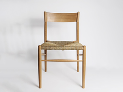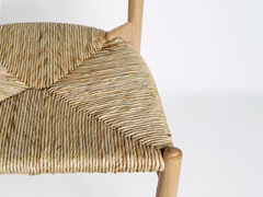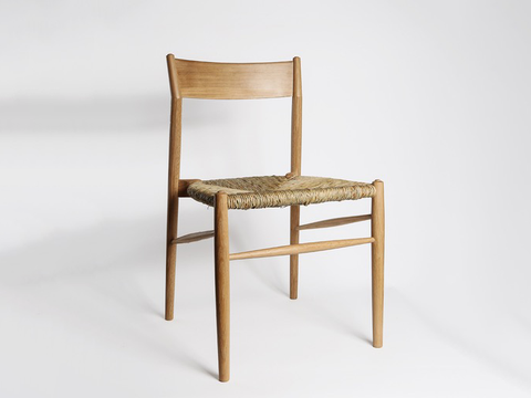 The angled struts, the feathered backrest, and the stand-off between seat and back leg give this simple modern chair a precise engineered look. Strength and lightness, and then a traditional woven rush or cord seat for counterbalance.