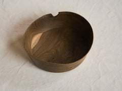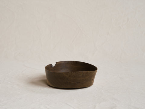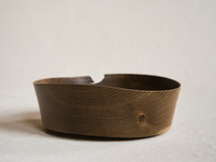A subtle irregularity along the rim and a single knot in the grain draw the eye, grounding the vessel in the living history of the tree. Smoked to soften and deepen its tone, the oak reveals gentle, unsaturated hues across its surface. Finished with natural oil and wax, the piece feels understated, tactile, and serene. Its form is wide and low, opening outward in quiet simplicity. Turned from oak, sourced as an offcut from a local sawmill.